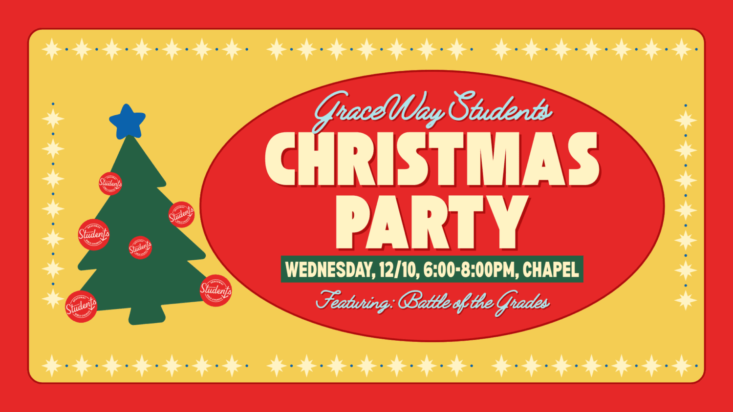 Come celebrate Christmas on December 10 at 6:00pm. There will be festive games, food, and prizes! It will be our Battle of the Grades as Middle School competes with High School in mini games. This will be our last Wednesday night of the year, so we hope to see you before Christmas break!